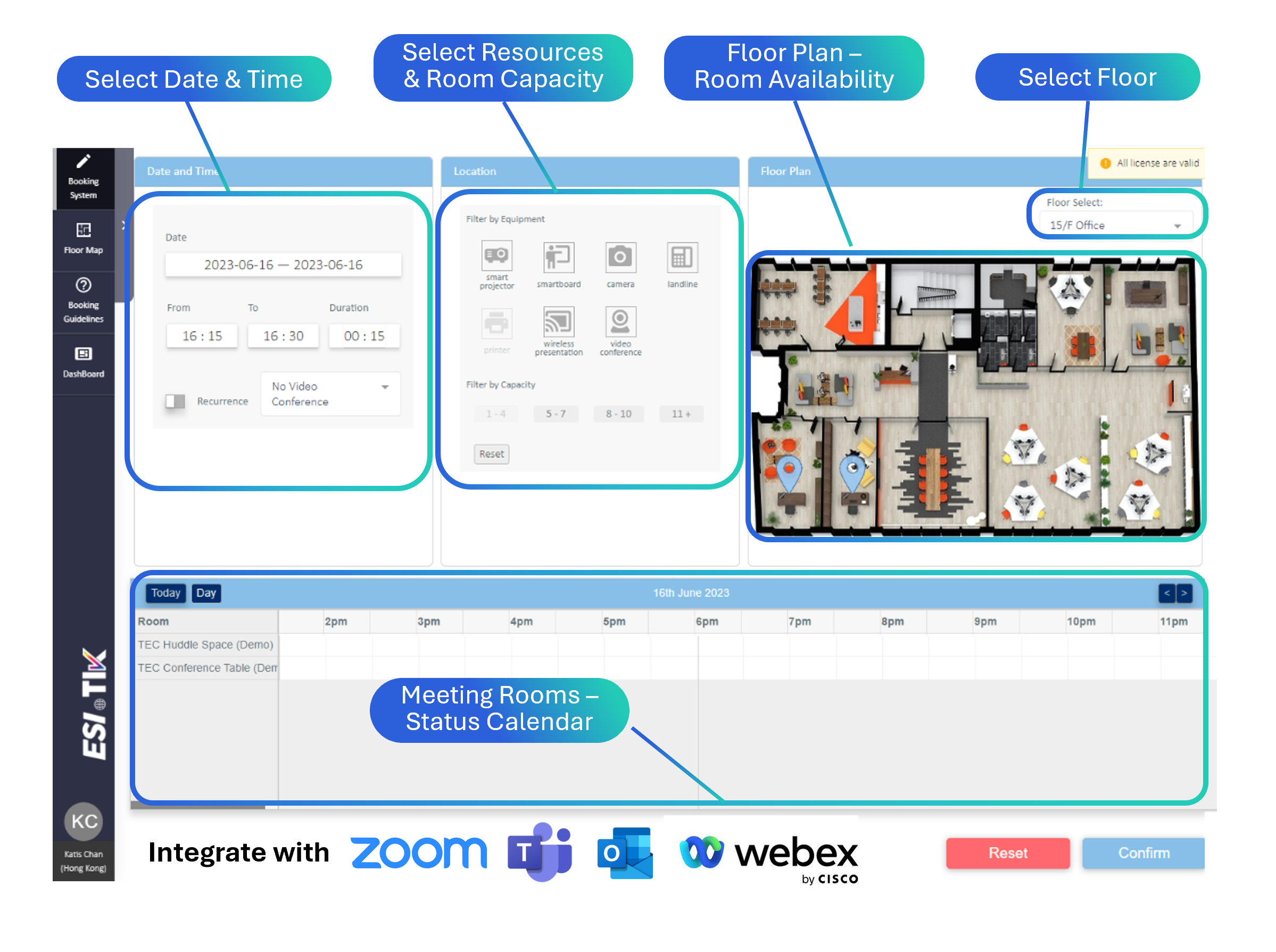 Schedule meetings directly from Teams, Outlook, Zoom, and Webex while syncing room availability in real time