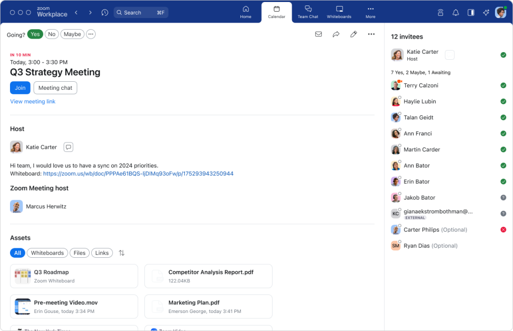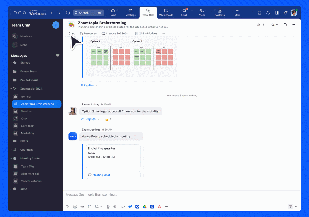Our workdays are heavily centered on meetings, encompassing preparation, attendance, and implementing decisions arising from them. Within Zoom Workplace, you can amalgamate your calendar and meetings into a single, efficient tab, facilitating seamless information sharing and collaboration both before and after meetings.